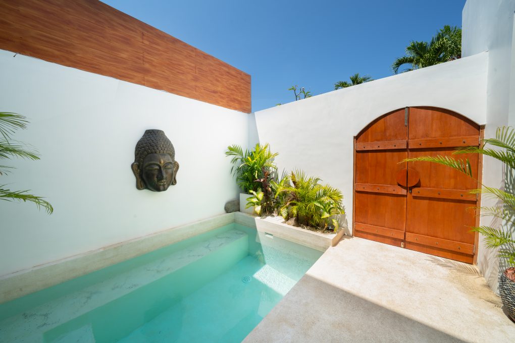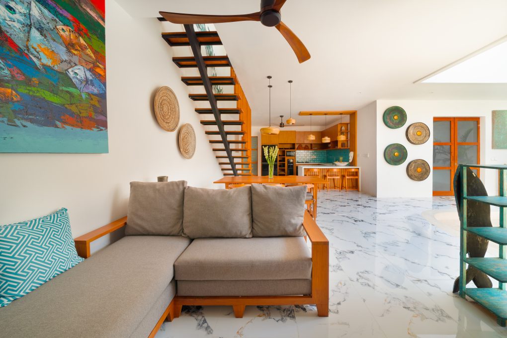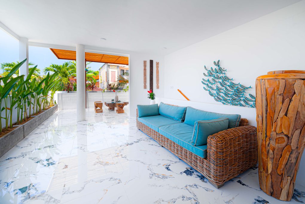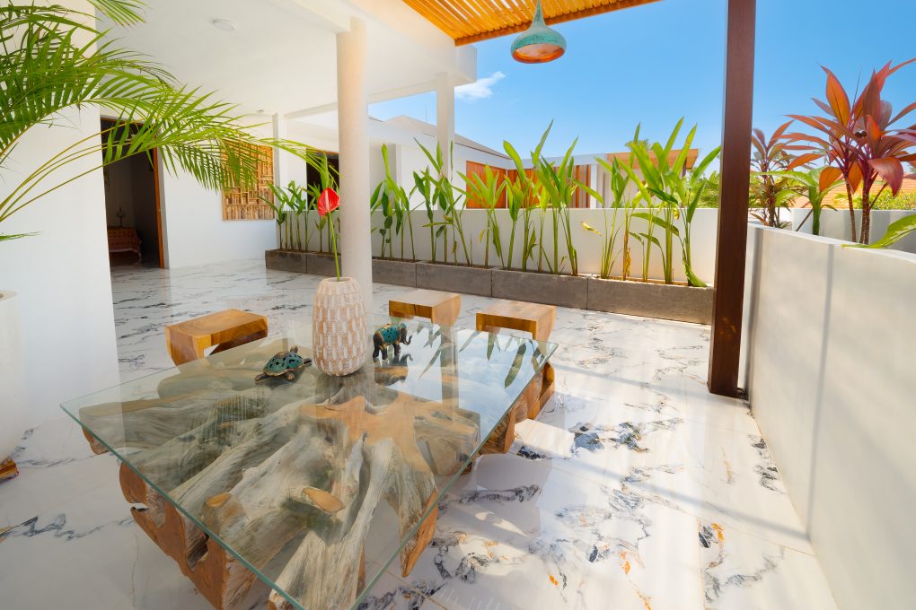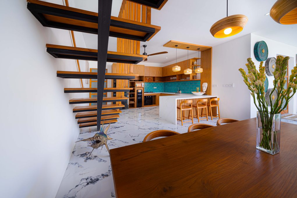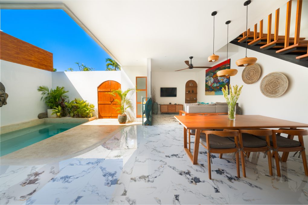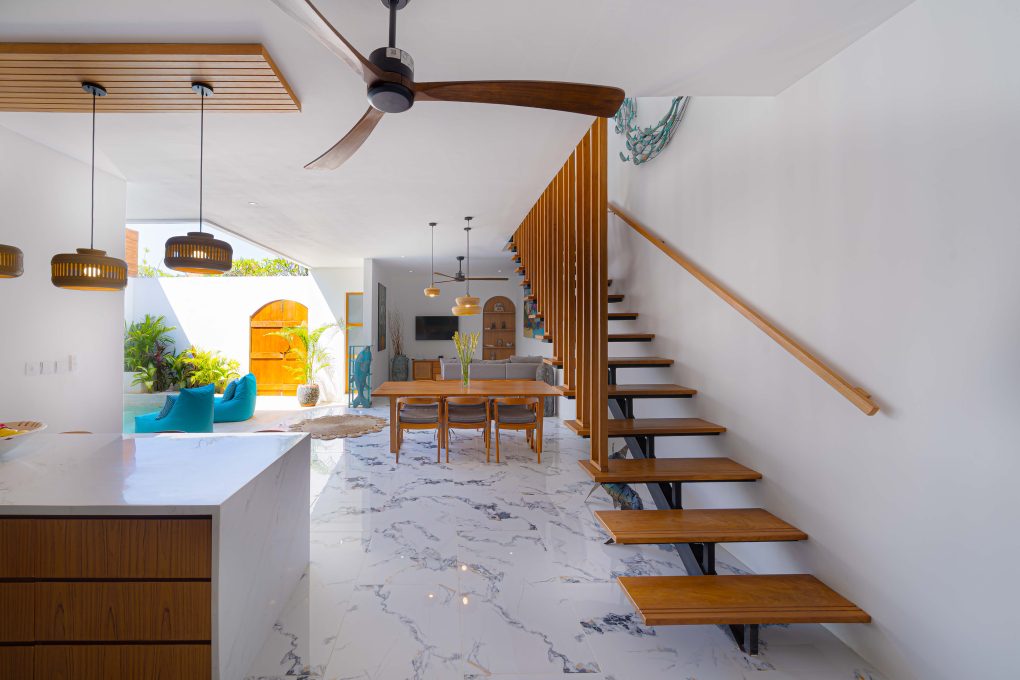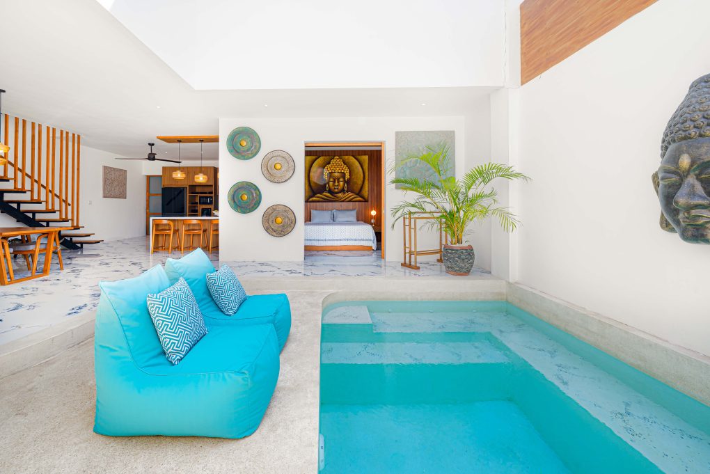 Downstairs, there is 1 bedroom located directly in front of the pool. You’ll also find a fully equipped kitchen and an open-style living room, perfect for enjoying the tropical breeze.