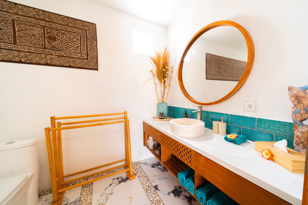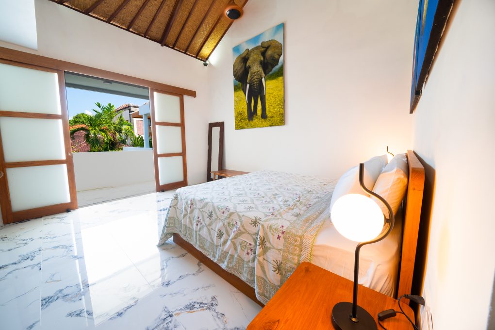 Upstairs, Villa Kembar features 2 bedrooms, each with its own bathroom and a shared balcony complete with rattan daybeds for relaxing.