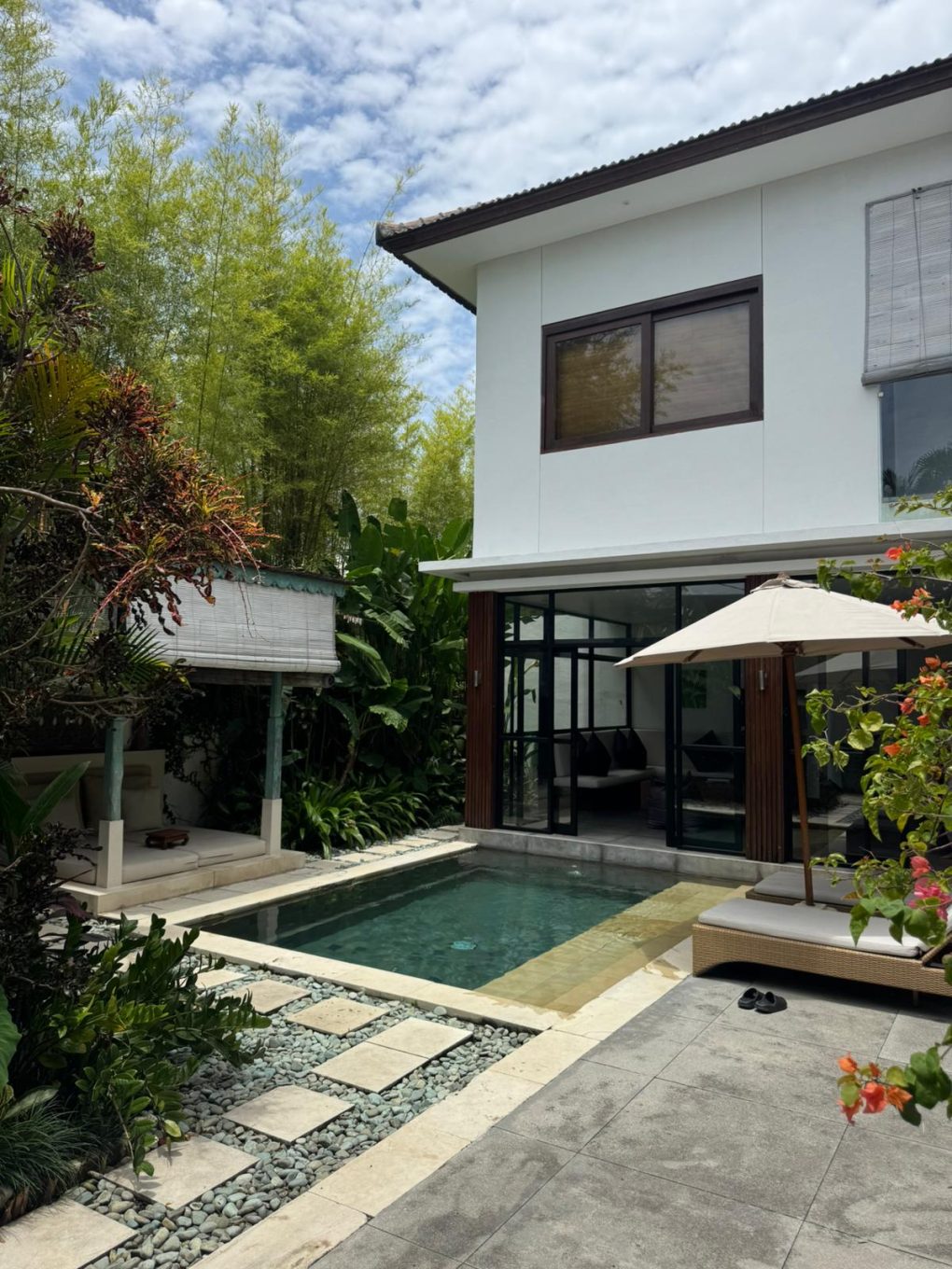 Enjoy your holidays in this beautiful 3 bedrooms villa, ideal for family or friends traveling. Ideally located between Seminyak and Canggu beaches, our property is very close to restaurants, cafes, commodity stores, SPA, Gym …etc. A lovely gazebo in front of pool is perfect for some relaxing reading. Both bedrooms upstairs open onto a large balcony and small garden ideal for sunset drinks or early morning yoga exercise.