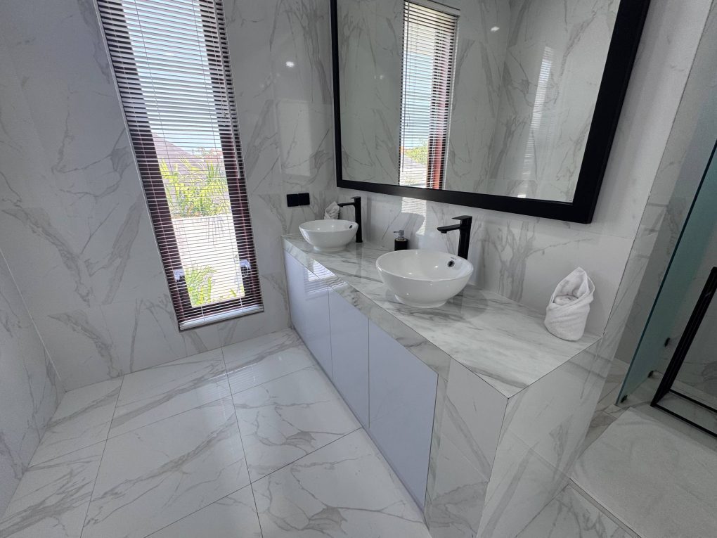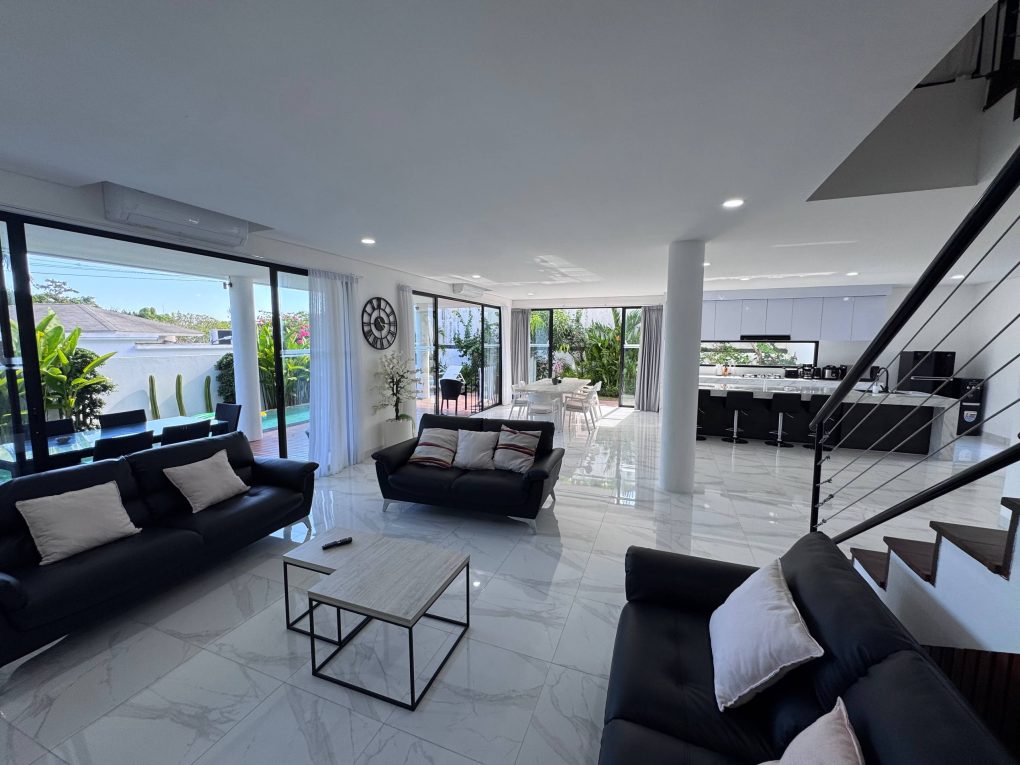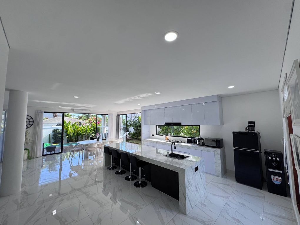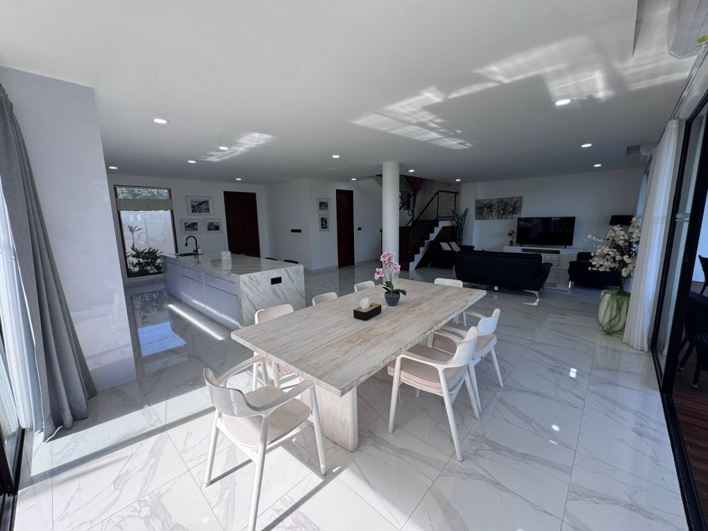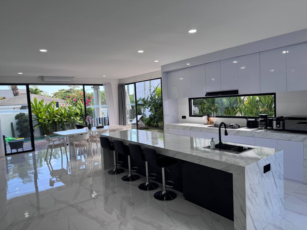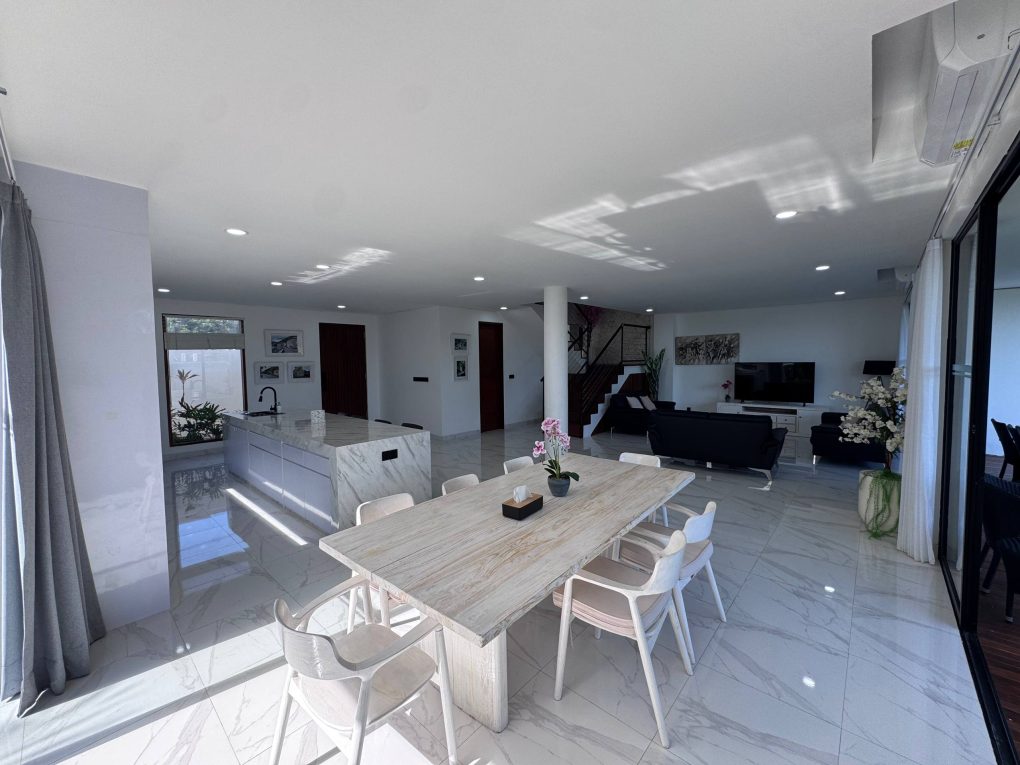 Designed with a sleek modern aesthetic, this two-level villa offers a seamless blend of comfort and tropical living. The spacious open-plan living and kitchen area features elegant marble finishes, high ceilings, and abundant natural light, creating a bright and airy atmosphere throughout.