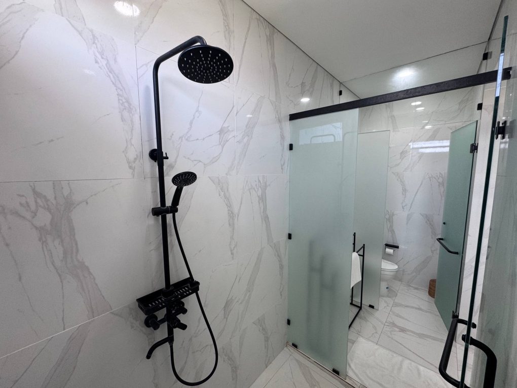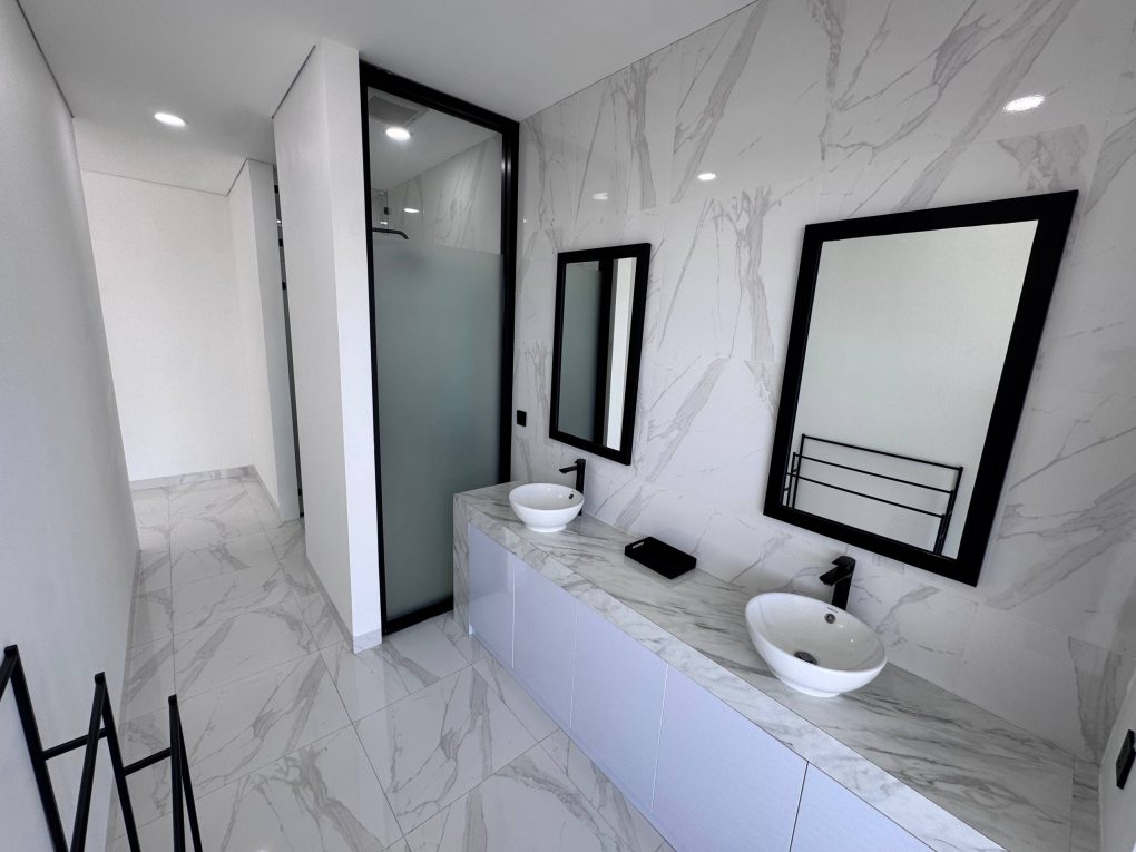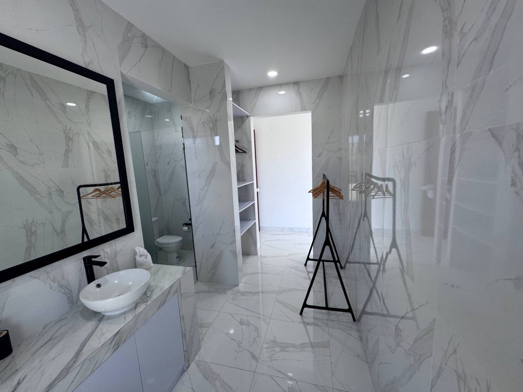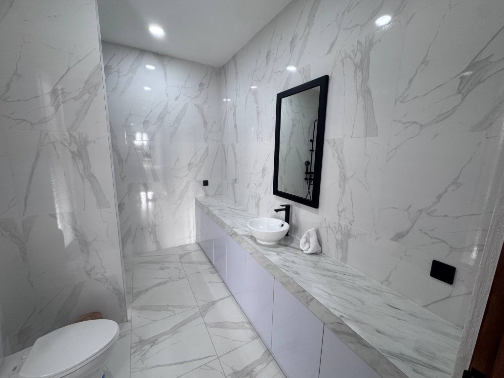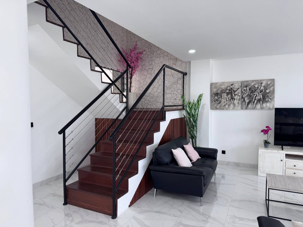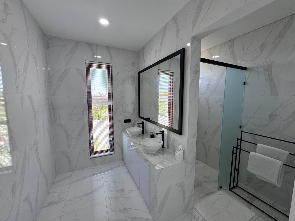 Designed with a sleek modern aesthetic, this two-level villa offers a seamless blend of comfort and tropical living. The spacious open-plan living and kitchen area features elegant marble finishes, high ceilings, and abundant natural light, creating a bright and airy atmosphere throughout.