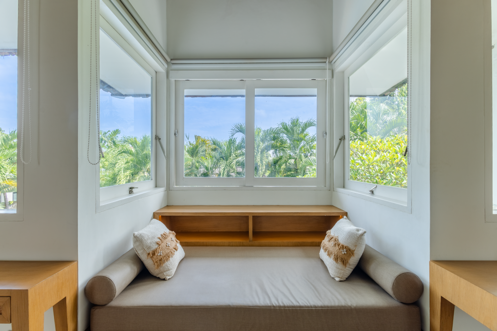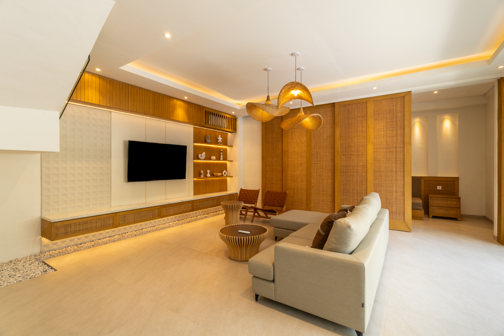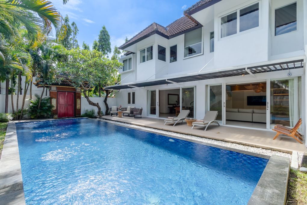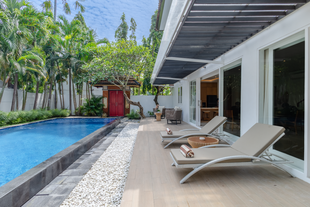The outdoor area features a private swimming pool surrounded by tropical greenery, perfect for relaxing or entertaining. Large sliding glass doors provide a seamless indoor–outdoor flow, filling the villa with natural light throughout the day.
