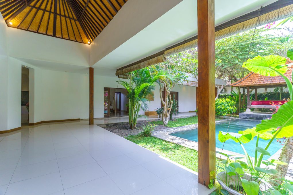 3 Bedroom Villa the beauty of a spacious garden that seamlessly blends indoor and outdoor living. Step outside to discover a private garden featuring a children’s playground, perfect for family relaxation. The living area overlooks the sparkling swimming pool and its charming gazebo, providing an ideal spot to watch the kids play.